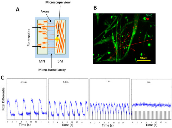 The biological role of skeletal muscle is to respond to MN electrical stimulation and contract. Thus, it was important to investigate the capability of these iPSC-derived skeletal myofibers to form functional NMJs. This capability was assessed in the dual chamber NMJ system [18], in which the muscle chamber and MN chamber are connected through microtunnels which allows the passage of axons. These two chambers are electrically and chemically isolated so that the stimulus in one chamber (whether electrical or chemical) will not affect the cells in the other chamber (Figure 8A). For this experiment, in order to detect the functional NMJ formation, electrical stimuli were applied to the MN chamber while myofiber contractions were monitored in the muscle chamber by phase contrast microscope and a fast video camera. The contractions that synchronized with electrical stimuli were considered as being induced by MN excitation and indicating functional NMJs. IPSC-derived myogenic progenitors and iPSC-derived MNs were co-cultured in this dual chamber, each in its own medium. MNs were differentiated from the same iPSC line as the SKM. MN stock from this iPSC line has a high MN purity and the MNs have been characterized and utilized in multiple published studies, both by immunocytochemistry and for function [17,18,32]. Multiple chambers were tested and functional NMJs were detected in each chamber. As in Figure 8B, immunocytochemistry revealed extensive extension of MN axons into the SKM chamber. Electrical stimulation of the MNs induced myotube contraction locations, indicating sites of functional NMJ formation. Altering the stimulation frequency in a range from 0.33, 0.5, 1 and 2 Hz induced myotube contractions at correspondent frequencies, indicating the high functional fidelity of the NMJs (Figure 8C) [18]. A video is included to demonstrate the recording process and myofiber contractions in correspondence to field electrical stimulations on the MN side at these frequencies (Video S1). The successful innervation of iPSC-SKM by the MNs derived from the same iPSC line indicates the capability of developing patient-specific NMJ models for disease model applications.