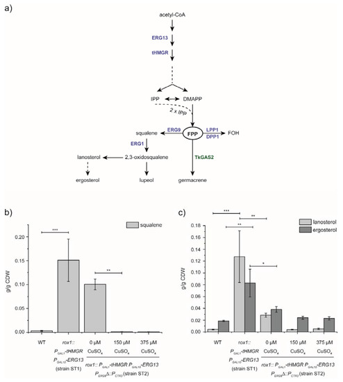 Redirection of MVA-pathway flux. (a) Schematic representation of the MVA-pathway leading to FPP-synthesis and downstream metabolites. Dashed arrows represent multiple enzymatic steps. Yeast enzymes are indicated in blue. T. koksaghyz-derived enzyme TkGAS2 is indicated in green. HMGS, 3-hydroxy-3-methylglutaryl-coenzyme A (HMG-CoA) synthase; HMGR, 3-hydroxy-3-methylglutaryl-coenzyme A (HMG-CoA) reductase; IPP, isopentenyl diphosphate; DMAPP, dimethylallyl diphosphate; FPP, farnesyl diphosphate; FOH, farnesol; LPP1, lipid phosphate phosphatase 1; DPP1, diacylglycerol pyrophosphate phosphatase 1; TkGAS2, T. koksaghyz germacrene-A synthase 2; ERG9, squalene synthase; ERG1, squalene epoxidase. (b) Yeast strain ST1 carrying the construct for tHMGR and ERG13 overexpression (rox1::PGAL1-tHMGR PGAL10-ERG13) showed a significantly enhanced squalene accumulation compared to the wild type strain (WT). Yeast strain ST2 carrying the additional copper-sensitive CTR3 promoter (PCTR3) prior to the HMGS coding sequence (strain ST2: rox1::PGAL1-tHMGR PGAL10-ERG13 PERG9∆::PCTR3) showed a reduced squalene content even without addition of CuSO4 to the culture medium. This effect was significantly enhanced upon the addition of 150 and 375 µM CuSO4, respectively, indicating the redirection of the metabolic MVA-pathway flux. (c) Lanosterol and ergosterol content in the designated yeast strains. Lanosterol and ergosterol content in yeast strains carrying the overexpression cassette for tHMGR and ERG13 (rox1::PGAL1-tHMGR PGAL10-ERG13) showed significantly higher sterol content compared to the WT. Sterol accumulation diminished upon integration of PCTR3 prior to the ERG9 coding sequence. n = 3 individual transformants; CDW, cell dry weight; * p ≤ 0.05, ** p ≤ 0.01, *** p ≤ 0.001.