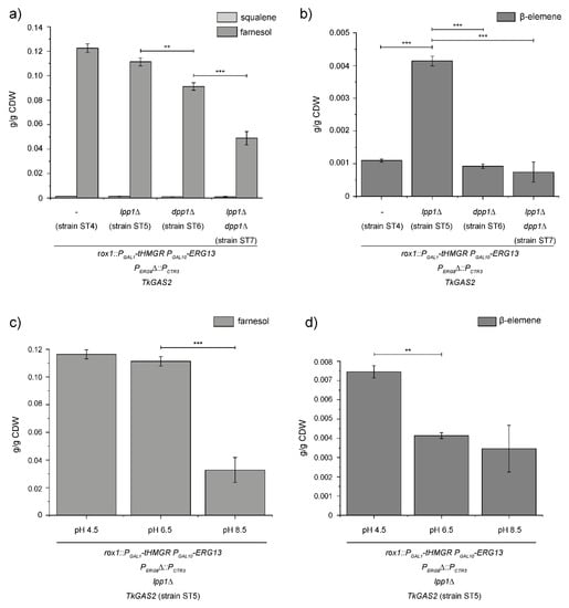As we could decrease the enzymatic degradation of FPP to trans-trans-farnesol by the knockout of LPP1, we further aimed to decrease hydrolysis of FPP by optimisation of the culture media, allowing its intracellular accumulation for downstream reactions as e.g., germacrene-A synthesis. As Muramatsu and colleagues reported in 2008 [21], FPP hydrolysis was the basis for increased farnesol production in an ERG9-deficient yeast strain and is dependent on the pH value of the culture medium. Therefore, we tested different initial pH values of the culture media ranging from pH 4.5 to pH 8.5 and measured the trans-trans-farnesol and β-elemene content in the n-dodecane layer (Figure 3c,d). Thereby, we could detect a decreased trans-trans-farnesol content of 0.0328 g/g CDW produced by the yeast cultured at an initial pH of 8.5 in contrast to 0.1113 g/g CDW trans-trans-farnesol produced by the strain cultured at an initial pH of 6.5, whereas the germacrene-A synthesis was not significantly affected (0.0035 g/g CDW). The trans-trans-farnesol production of the yeast cultured under an acidic initial pH of 4.5 did not show a significant change in trans-trans-farnesol production (0.1163 g/g CDW), which is in accordance to the most comparable measurements of Muramatsu and colleagues [21]. However, the acidic pH almost doubled the germacrene-A synthesis of our engineered strain (0.0075 g/g CDW) compared to the strain cultured under the previously used conditions (pH 6.5; 0.0041 g/g CDW), which may reflect the decrease of FPP hydrolysis.