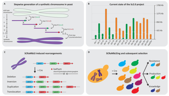Synthesising a 12 Mb genome is an extraordinary scientific endeavour and might be one of the biggest efforts in science since the sequencing of the human genome [82] (Figure 2A,B). The first partially synthetic yeast chromosome was published in 2011, presenting the synthetic right arm of chromosome IX, synIXR [83]. However, the idea was born earlier and intensive planning was performed before the physical start of the Sc2.0 project. The Sc2.0 project aimed to not only be a redesign of the natural yeast genome; multiple design rules were implemented and applied to the whole yeast genome [21]. Perhaps the most significant of these, at least from the applied perspective, could be the integration of symmetrical loxP sites (loxPsym) 3 bp downstream of every non-essential gene [83]. Upon the expression of Cre recombinase, the synthetic chromosome(s) are like a deck of cards and extensive genome alterations are possible: the cards can be shuffled, turned around and added to or removed from the deck (Figure 2C). This system is termed Synthetic Chromosome Rearrangement and Modification by LoxPsym-mediated Evolution or, in short, SCRaMbLE [83,84]. Another important alteration is the removal of all 275 nuclear tRNA genes from their native loci, followed by their relocation on a neochromosome, the 17th nuclear chromosome in the Sc2.0 strain [21,85]. One of the main reasons for this is to create a more stable yeast genome, as tRNA genes are known hotspots for genomic instability, e.g., by head-on collision of DNA replication and transcription machinery or via the preferred transposon integration upstream of tRNA genes in yeast [86,87,88,89,90]. Stably integrating additional chromosomes into the nuclear genome of yeast has a huge potential and the Sc2.0 tRNA neochromosome may pave the way to deeper understanding of how extraordinarily complex constructs can be built and maintained as additional chromosomes.