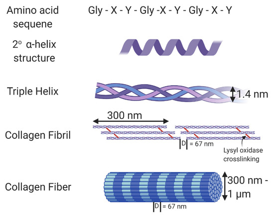 Structure of collagen. The amino acid sequence of collagen consists of Gly-Xaa-Yaa repeats, with Xaa and Yaa commonly occupied by proline and hydroxyproline. This unique sequence allows collagen to form an α helix secondary structure. Fibrillar collagen is a triple helix containing crosslinks formed through the action of lysyl oxidase. In vivo, these collagen fibrils form fibers with varying thickness and a D-banding pattern of 67 nm. Made using Biorender.