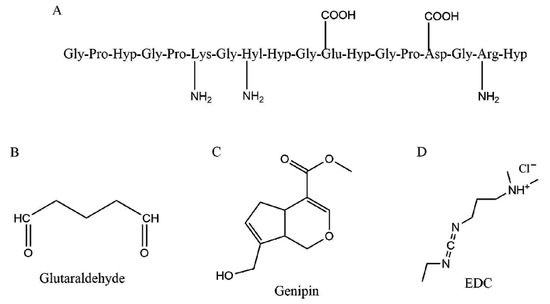 Chemical crosslinking of collagen. Crosslinks are primarily introduced in collagen by targeting carboxylic acid groups on Asp and Glu residues, or amines on Lys, Hyl, and Arg groups (A–D) show some common crosslinkers used to modify collagen.