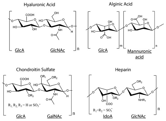 Structures of glycosaminoglycans (GAGs). Disaccharide monomer repeats of glucuronic acid (GlcA) or its epimer iduronic acid (IdoA), and N-acetylgalactosamine (GalNAc) or N-acetylglucosamine (GlcNAc) form the backbone of GAGs, except alginate, which is a GAG analog with GlcA and mannuronic acid repeats. Chondroitin sulfate and heparin are post-translationally sulfated and contain SO3− groups on some disaccharide units.