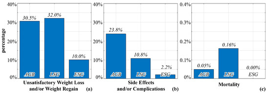 Currently, there are no specific guidelines for the selection of the optimal procedure. Usually, clinical evidence, the surgeon’s experience, and the patient’s medical conditions inform the choice of bariatric procedure. Surgical procedures are characterized by different postsurgical complications and drawbacks: hernias and ulcers can occur after RYGB, whereas AGB must deal with complications related to band position, migration, and erosion. The most controversial issue for LSG is gastroesophageal reflux disease due to both the increase of esophagogastric junction angle and the strong reduction of the stomach [14]. In general, unsatisfactory weight loss or weight gain is a possible postsurgical complication, and altered food approaches affect up to 25% of bariatric patients [15,16,17,18,19,20,21,22,23,24] (Figure 1), leading to the need for improvements in BS.