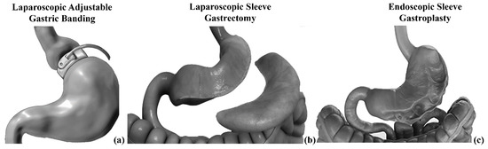 The investigated BS techniques: laparoscopic adjustable gastric banding (a), laparoscopic sleeve gastrectomy (b), and endoscopic sleeve gastroplasty (c).