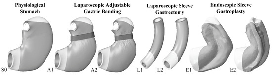 A computational mechanical model of the stomach was used to investigate gut functionality in both physiological (S0) and postsurgical conformations (Figure 3). In detail, different bariatric techniques were analyzed, such as LAGB (A1: 25% band pretensioning; A2: 40% band pretensioning), LSG (L1: 32 Fr bougie size; L2: 40 Fr bougie size), and ESG (E1: two-point stitch configuration; E2: three-point stitch configuration).