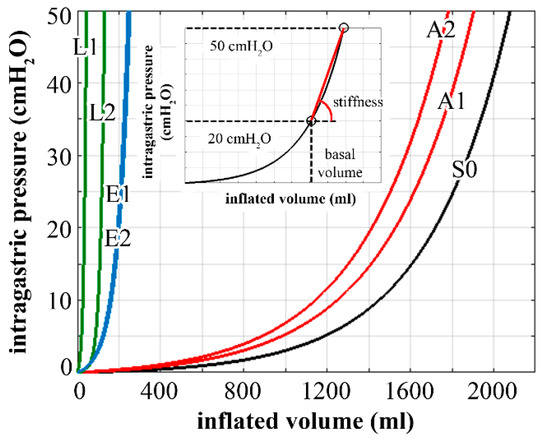 Computational analysis of stomach inflation: pressure–volume behavior of physiological stomach (S0), and postsurgical stomach after laparoscopic adjustable gastric banding (A1, A2), laparoscopic sleeve gastrectomy (L1, L2), and endoscopic sleeve gastroplasty (E1, E2). The subplot reports the procedure for the calculation of stomach basal volume and stiffness.