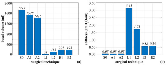 The resulting basal volumes were 1719, 1528, 1415, 34, 113, 201, and 193 mL, and the measured stiffness amounted to 0.08, 0.08, 0.08, 3.13, 1.73, 0.58, and 0.59 cm H2O/mL for S0, A1, A2, L1, L2, E1, and E2 configurations, respectively (Figure 5).