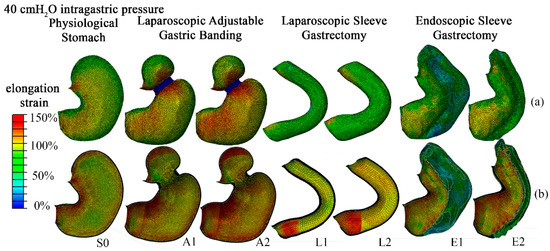 Contours of stomach distension as tissue elongation strain at 40 cm H2O intragastric pressure: comparison of results for physiological stomach (S0), laparoscopic adjustable gastric banding (A1, A2), laparoscopic sleeve gastrectomy (L1, L2), and endoscopic sleeve gastroplasty (E1, E2) for the outer (a) and inner layers (b).