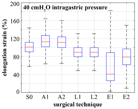 Box plots representing the distribution of stomach distension as tissue elongation strain within the overall stomach wall: comparison of results for the physiological stomach (S0), laparoscopic adjustable gastric banding (A1, A2), laparoscopic sleeve gastrectomy (L1, L2), and endoscopic sleeve gastroplasty (E1, E2).