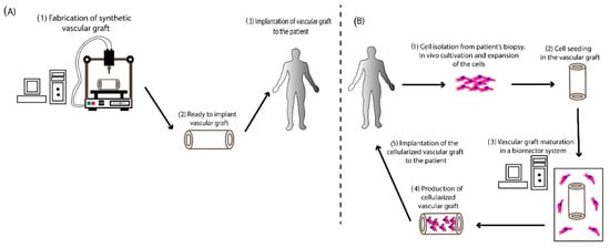 Development and implantation of engineered small-diameter vascular grafts (SDVGs). (A) The first approach comprises the production of acellular SDVG derived from polymer materials using the state-of-art bioprinting approach. Then, the manufactured SDVG can be implanted immediately into the patient. In this approach, the patient’s body will serve as a bioreactor for the recellularization of the implanted vascular graft. However, some major disadvantages, including the time period needed for the proper cellularization or the impaired functionality of the produced vascular grafts, maybe existed. (B) The second approach comprises the combination of cellular populations with the polymer derived SDVGs. In this approach, the cells can be isolated from the patient’s tissue biopsy, in vitro expanded, and seeded onto the SDVG. Finally, the engineered SDVG can be implanted back to the patient. The advantage of this approach is the production of compatible SDVGs with the patients, avoiding in this way any potential adverse reactions.