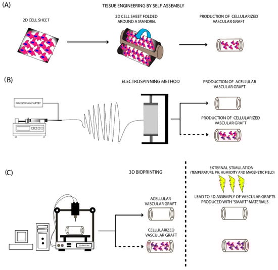 Fabrication methods for the production of SDVGs. (A) Production of SDVGs with the originally proposed method of L’Heureux et al. In this method, the production of SDVGs was relied on the self-assembly of cell sheets using a tubular mandrel. (B) Production of SDVGs with the electrospinning method. This methodology can produce complicated extracellular matrices (ECMs). In addition, combination with cellular populations can lead to the development of cellularized structures. (C) Production of SDVGs with the bioprinting method. Bioprinting offers the potential for the production of either acellular or cellularized complicated structures. Moreover, when used “smart” materials in the production process, the final product can assembly on the desired structure upon external stimulation (e.g., temperature, pH, humidity, and magnetic field).