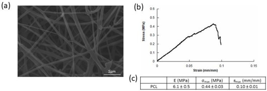 (a) Scanning Electron Microscope (SEM) micrographs of dry electrospun PCL without cells. (b) Stress-strain curve for electrospun PCL meshes. (c) Tensile tests on electrospun PCL meshes: modulus (E), maximum stress (σmax), and maximum strain (εmax) reported as mean value ± standard deviation (SD).
