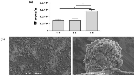 Cell growth on biomaterials was evaluated at 1, 3, and 7 days from seeding through formation of resofurin, whose mean fluorescence intensity (MFI) correlates with the number of viable cells (Figure 3a). No differences in MFI were detected between 1 and 3 days, whereas at 7 days, cell viability significantly increased. Cell cultures, grown on tissue culture plates, were considered the control group. At 1 day, MFI values were significantly higher than those detected in PCL-based cultures. Nevertheless, at 3 days, cells on tissue culture plates detached because they did not stratify in this culture condition (data not shown). Starting from these data, further experiments were carried out on cultures grown on PCL-based scaffolds at 7 days from seeding. Morphological analysis, carried out by SEM, showed that the scaffold surface was completely covered by HCC1954 cells (Figure 3b). PCL cultures were coated by polygonal shaped cells that were randomly orientated and stratified. Moreover, smaller cells organized themselves to form spheroids laying on the layer generated by the previous cells.