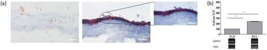 (a) Alcian blue staining of cultures grown on PCL at 7 days from seeding. Image on the left shows PCL scaffold without cells, whereas images on the right report PCL-based cultures. Mucopolysaccharides stain blue, and cytoplasm red. Bars: 100 and 50 µm. (b) RT-PCR analysis of HAS1 of cultures grown on tissue-culture polystyrene (TCP), and PCL scaffolds at 7 days from seeding. Quantification of transcript levels was carried out by densitometric analysis using ImageLab software. Data were reported as the percentage from TCP taken as 100. * p < 0.05 vs. TCP cultures; Student’s t test.