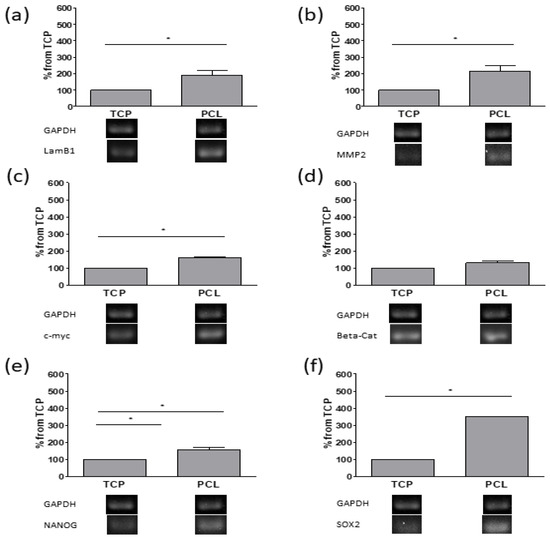 RT-PCR analysis of LamB1 (a), MMP2 (b), c-myc (c), β-cat (d), NANOG (e), and SOX2 (f) of cultures grown on tissue-culture polystyrene (TCP), and PCL scaffolds at 7 days from seeding. Quantification of transcript levels was carried out by densitometric analysis using ImageLab software. Data were reported as percentage from TCP taken as 100. * p < 0.05 vs. TCP cultures; Student’s t test.