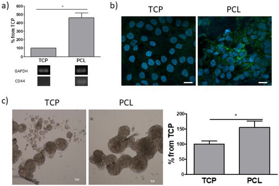 Then, the expression of CD44, a transmembrane glycoprotein acting as a hyaluronan receptor, was evaluated (Figure 6a). Both RT-PCR and immunofluorescence demonstrated higher CD44 levels in on PCL-based cultures than that observed in adherent cell cultures. Since CD44 is also a surface marker of cancer stem cells (CSCs) [43], the sphere forming assay, which functionally assesses the presence of a stem cell population and the capability of reinitiate tumor formation, was carried out (Figure 6b). A significantly higher number of spheres arose from cells previously cultured for 7 days in PCL with respect to those derived from cells grown on tissue-grade plastic.