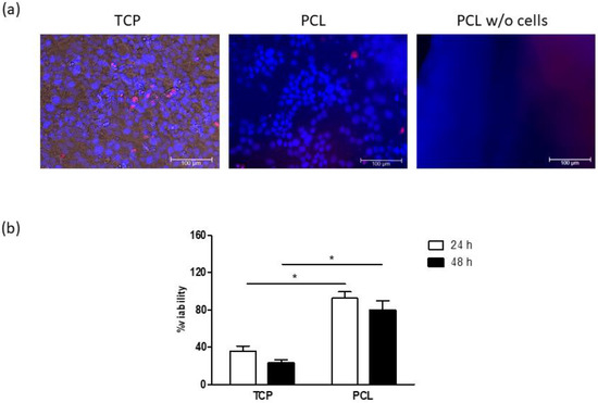 (a) Representative images of cultures at 15 min of doxorubicin treatment: nuclei and doxorubicin are blue and red, respectively. Bars: 100 µm. (b) Cell viability after 24 and 48 h exposure periods to 5 µM doxorubicin. Results are reported as percentage from the corresponding non-treated cultures. * p < 0.05 vs. cultures grown on tissue-culture polystyrene (TCP); Student’s t test.