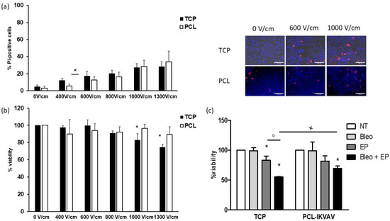 EP was carried out on adherent cell cultures on TCP and PCL-based cultures by applying an increasing electric field intensity. In non-treated cultures (0 V/cm), only electrode was inserted, and no electric field was applied. Cell membrane permeabilization was assessed through PI staining, whereas cell viability was determined at 72 h from EP (Figure 8a,b). In both cell cultures, the percentage of PI-positive cells was progressively enhanced by increasing electric fields and reached about 30% at high voltages. No differences were observed between the two culture models, except at 400 V/cm, where significantly higher values were detected in cultures grown on TCP. However, in PCL-based cultures, cell viability was not affected by the electric field application, whereas significant decreases were detected in culture grown on TCP at 1000 and 1300 V/cm. Adherent cells and PCL-based cultures were treated with 10 µM bleomycin and electroporated by applying 8 pulses, 100 µs long, delivered at 5 kHz and using a voltage amplitude of 700 V (electric field intensity of 1000 V/cm). After a 24 h incubation period, cell viability was assessed (Figure 8c). As expected, bleomycin alone showed no effects in both cultures. On the other hand, EP significantly decreased cell viability in cultures grown on TCP, but not in PCL-based ones. Cytotoxic effects of EP/bleomycin were significantly higher in cells grown on TCP compared to those detected in PCL-based cultures.