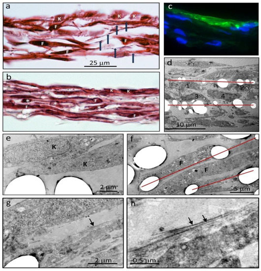 The arrangement of cells and relationship to the fibers were more clearly seen by electron microscopy (Figure 3d–f). The fibers were removed by the processing solvents, but their location and profiles were clearly evident. Notably, the volume of the fiber support framework was a relatively small fraction of the tissue volume (11% in Figure 3d) and the position of the cells relative to the fibers in each layer was clearly evident, with cells seeded on each side of individual layer frames retaining their relative positions (Figure 3d). Both keratinocytes (Figure 3e) and fibroblasts (Figure 3f) displayed points of attachment to the fibers, and some fibroblasts spanned adjacent parallel strands in the same layer. Between and around fibroblasts, a pericellular matrix of variable density was deposited, extending up to ~0.5 µm from the cell surface, with small-diameter collagen fibrils on the outer edge of this matrix (Figure 3g,h).