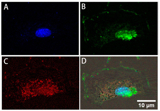 Confocal microscopy images illustrating a human NEDAPS cell: (A) DAPI staining the nucleus, (B) Sox2, (C) Klf4, and (D) overlay of the multiple staining (mag. 640×).