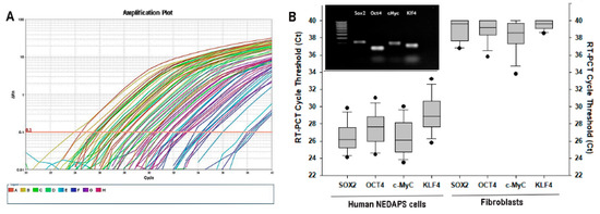 (A) An example of a Real-Time PCR amplification plot indicating the replication curves of the specific mRNA tested, with SYBR Green labeling. (B) Cycle Thresholds of the four stem cell markers in human NEDAPS cells and the control fibroblastic cells were summarized. The insert in (B) illustrates an electrophoresis image of PCR products after the Real-Time PCR, with specific primers for the four transcription factors, on the BMP-2-treated cells isolated from human peripheral nerves. The first lane shows a 100 pb DNA ladder.