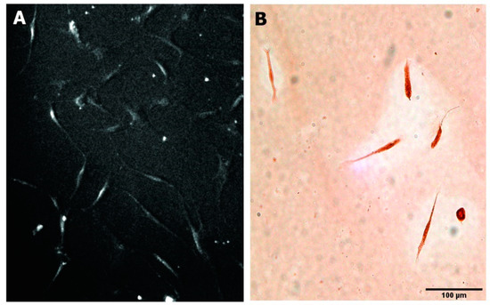 When the culture media for the human NEDAPS cells were changed to the complete fibroblast induction medium, the cells rapidly dispersed from their small colonies and assumed the classic “spindle shape” of motile fibroblasts within 24–48 h (Figure 5). Immunohistochemical staining against fibroblast activation protein (FAP) confirmed that they become FAP positive.
