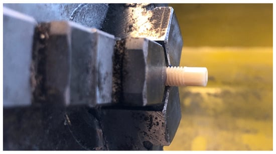 5 mm M5 prototype screw with external hexagon head made of cortical human donor bone for validation of the FEM-analysis fixed in a three-jaw chuck.