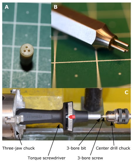 To verify the simulation results of the 3-bore drive, an experimental verification of the failure torque was carried out with a prototype screw, which is depicted in Figure 4A. For the prototypes, the same screws made from human cortical bone were used as for the validation, they were face turned and the three bores were drilled using a CNC-machine (PRO-BASIC-H 06/05, CNC-Modellbau, Gerabronn, Germany) and a 0.8 mm carbide drill (Bungard Elektronik GmbH & Co. KG, Windeck, Germany). The G-code was created with Fusion 360 and is available as extended data in []. The spindle speed was set to 10,000 rpm and the feed rate to 0.5 mm/s. The failure torque was measured with a torque screwdriver (Torsiometer Nr. 760/7,5, STAHLWILLE Eduard Wille GmbH & Co. KG, Wuppertal, Germany). Since the tool holder of the torque screw driver is designed for 1/4″-hexagon bits, the insertion tool for the prototype screw was manufactured as a hexagon bit by drilling three bores and inserting hardened 0.8 mm-pins into an already existing hexagon bit made of tool steel (Figure 4B). It must be mentioned that with this insertion tool a complete insertion of the screw is not possible, as this is not necessary for the verification of the failure torque. In Figure 4C the setup of the failure torque measurement is depicted. In order to minimize the bending moment on the screw during the application of the torque, the whole arrangement was mounted on a lathe as follows: The handle of the torque screwdriver was clamped into the three-jaw chuck, the 3-bore insertion tool was inserted into the screwdriver and the prototype screw was secured with the center drill chuck. The torque was then applied by hand on the three-jaw chuck until failure of the prototype screw.
