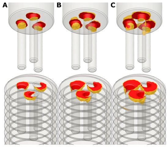 Results of the FEM-analysis of the 3-bore drive at different torques. Only the red zones with von Mises stresses higher than the yield stresses (100 MPa for the screw and 650 MPa for the insertion tool) are shown. (A) 200 Nmm; (B) 300 Nmm; (C) 400 Nmm.