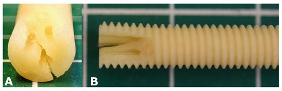 Prototype screw after failure torque measurement: (A) top view; (B) side view.