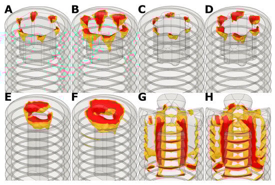 Results of the FEM-analysis of conventional drives at different torques. Only the red zones with von Mises stresses higher than the yield stresses (100 MPa for the screw) are shown. (A) 2.5 mm internal hexagon 200 Nmm; (B) 2.5 mm internal hexagon 300 Nmm; (C) Torx T10 200 Nmm; (D) Torx T10 300 Nmm; (E) 2 0.8 mm slot 200 Nmm; (F) 2 0.8 mm slit 300 Nmm; (G) Claw clutch 400 Nmm; (H) Claw clutch 500 Nmm.