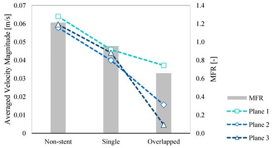 | Average Velocity Magnitude [×10–3 m/s] | Plane 1 | 64.0 | 45.7 | 37.1 |