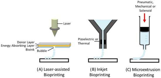 Types of 3D bioprinting. (A) Laser-assisted bioprinting, (B) inject bioprinting, (C) microextrusion bioprinting.