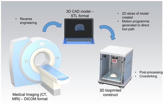 Extrusion-based 3D bioprinting has shown promise for the fabrication of constructs composed of both natural and synthetic biomaterial-based bioinks for cartilage tissue engineering applications. While the ability of these constructs to promote chondrogenesis has been demonstrated in vitro, further pre-clinical studies are required to demonstrate their efficacy in vivo. To date, 3D bioprinted constructs have yet to be successfully translated to the clinic. The technique has been shown to have good reproducibility and potential for mass scalability and it also shows promise for use in personalised medicine. However, limitations remain including high costs and complex regulatory pathways for the approval of tissued engineered constructs. The proposed clinical application of this technique in a personalised medicine approach involves three stages: (i) medical imagery, (ii) construct design, and (iii) construct bioprinting (Figure 3). The medical imaging stage employs imaging techniques such as computed tomography (CT) and magnetic resonance (MRI) to obtain a 3D image of the cartilage defect. This data is stored in the Digital Imaging and Communications in Medicine (DICOM) format, the standard image file format for medical imaging. Following this, the DICOM file is reverse-engineered and imported into computer-aided design (CAD) software. This enables the generation of a surface model that mimics the shape and structure of the defect site. This model is converted into an STL file and then used to create two-dimensional (2D) slices of the construct. A motion programme is then created which contains codes that provide the tool path information for the printer. Patient cells would then be harvested and combined with the desired biomaterial to produce a bioink. The desired construct would then be bioprinted in a layer-by-layer fashion. Finally, any post-processing or crosslinking required would be applied to achieve a final 3D bioprinted construct ready for implantation into the defect site [].