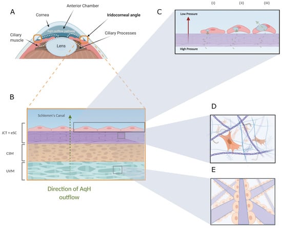 The AqH outflow pathway. (A) Diagram of the anterior chamber of the eye and direction of AqH movement towards the iridocorneal angle. The AqH outflow pathway within the iridocorneal angle is indicated by the bold orange square. (B) A magnified section of the AqH outflow pathway is presented with distinction and the 3 segments of the TM: Uveal Meshwork (UVM), Corneoscleral Meshwork (CSM), Juxtacanalicular Tissue and inner wall endothelia of the Schlemm’s canal (JCT and eSC). Green dotted arrow represents the direction of aqueous humour (AqH) flow through the TM and eSC, into the Schlemm’s canal. (C) eSC giant vacuole (GV) formation is presented: (i) Pressure builds on the basal side of the cell, opening micron-sized pores. (ii) AqH flows through the micron-sized pore, inducing a large cellular deformation (iii) Formation of GV structures, AqH enters into the lumen of the Schlemm’s canal. (D) Magnification of the JCT section, representing fibroblast-like TM cells sparsely embedded into a connective tissue matrix. (E) Magnification of the UVM section (also representative of the CSM section), with TM cells resting on collagen beams as a continuous monolayer, displaying an endothelial phenotype.