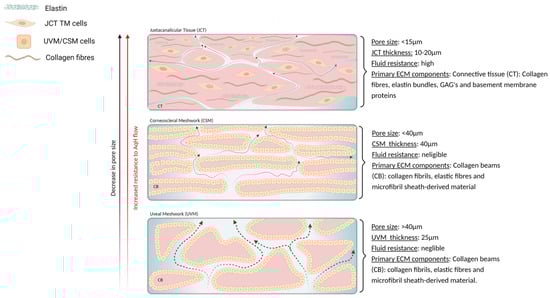 Choice of scaffold design, material selection and fabrication techniques are critical considerations when developing an AqH outflow model, with several biological factors needing to be taken into consideration to encompass the distinct morphological and functional features associated with IOP regulation. The importance of ECM dynamics within the TM for optimal AqH fluid dynamics and healthy IOP regulation is stated frequently in recent research, as molecular organisation and relative of abundance of these ECM components, for example, glycosaminoglycan’s (GAG), vary throughout the TM segments and are thought to be primary influencers of AqH outflow dynamics [,]. Additionally, human and porcine tissue studies have observed heterogeneity in ECM components and microarchitecture throughout the TM when controlled by local TM cells that are stimulated by various mechanical cues [,,,,,]. With these factors altering IOP, it is dysfunctions in these homeostatic mechanisms that leads to disease manifestation. Morphologically, the TM consists of three distinctive layers (Figure 2), which differ in structure and function: the uveal meshwork (UVM), corneoscleral meshwork (CSM) and the juxtacanalicular tissue (JCT). Porosity and pore size is a significant factor in appropriate AqH outflow, with a gradient of pore size existing within the TM [,]; the outermost sections of the TM (UVM and CSM) are characterised by a high pore density and size ranging between 2 and 75 µm (Figure 2) [,], providing negligible outflow resistance [,,]. The innermost part of the TM, the JCT, is widely regarded as a highly specialised area of connective tissue and not a meshwork, with a contrasting morphology, comparatively small pore size (<15 µm), and high resistance to fluid flow [,,]. Studies in both human and primate TM tissue have noted this substantially contrasting structure and cellular characteristics, leading many scholars to hold the view that the JCT is the primary site of AqH outflow resistance and dysfunction during POAG pathogenesis [,,,]. With importance being placed on the JCT region, appreciation of the JCT ECM architecture, biochemical makeup and TM cellular characteristics will be further discussed for replicating AqH outflow systems and POAG in the following section.