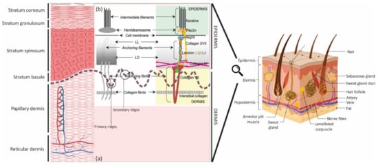 Skin schematic: (a) microstructure of the skin layers, magnifying the epidermis and dermis; created by Biorender and (b) DEJ representation. Schematic of different anatomical substructures, seen by transmission electron microscopy (the left diagram) (LL: lamina lucida and LD: lamina densa) and depicting the identified molecular components of substructures (the right diagram); reused with permission []—Reproduced by permission of The Royal Society of Chemistry.