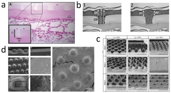 (a) µDERM topography (H&E); the insert illustrates the measurements made for depths (D) and widths (W) of the channels. Photo reused with permission [] © 2012 Tissue Engineering: Part A, Mary Ann Liebert, Inc. (b) Morphometric analyses of epidermal thickness in K microniches; (b1) The epidermal thickness (ET) is enhanced in the narrow channels, normalized by the channel depth (CD). (b2) The plateau thickness (PT) was measured immediately adjacent to each channel. Scale bar = 100 µm. Photo reused with permission [] © 2013 Acta Materialia Inc. Published by Elsevier Ltd. (c) SEM images of the patterned substrates fabricated by using 3 different masks. PHEMA molding precursor was exposed to UV light for 3 different intervals. Scale bars: 400 µm. Photo reused with permission [] © 2015 Integrative Biology, Oxford University Press. (d) SEM images of (A) patterned, (B) flat PDMS substrates before COL coating, (C) top view of patterned PDMS substrate before COL coating, (D) keratinocytes on flat, and (E–G) keratinocytes on undulating PDMS substrates. (F) A higher magnification view of the boxed region in (E). Scale bars: 100 µm and 50 µm (D,E). Photo reused with permission [] © 2019 Acta Materialia Inc. Published by Elsevier Ltd.