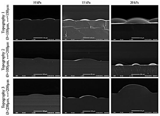 SEM of PDMS stamp depicting PLGA deformation by vacuum pressure. Deformation as a function of topography (1–3) and vacuum pressure (10, 15, or 20 kPa) are investigated. Photo reused with permission [] © 2019 Tissue Engineering: Part A, Mary Ann Liebert, Inc.