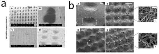 A reusable template made of polyetheneglycol diacrylate was created by stereolithography, then poly(3-hydroxybutyrate-co-3-hydroxyvalerate) was electrospun over the template to form DEJ microfeatures, and keratinocytes were cultured on it. The platforms ranged from 200 to 1000 µm, edge to edge, with depths varying from 200 to 500 µm (Figure 5a). Cells locate preferably on the microfabricated scaffolds within niche-like areas. Furthermore, increased metabolic activity was observed when keratinocytes were seeded on the structured scaffolds, indicating increased cell proliferation []. Patterned polycaprolactone (PCL) electrospun membranes (Pattern A: 192 µm-height and 959 µm-width, Pattern B: 133 µm-height and 360 µm-width and Pattern C: 167 µm-height and 430 µm-width) have been fabricated using microstereolithography-based templates made of methyl methacrylate polymer (RS-F2-GPGR-04) (Figure 5b) and air plasma treated to increase surface functionality. The microfeatures within the membranes enhanced cell metabolic activity and resulted in the accumulation of fibroblasts and keratinocytes at the bottom of these features. The pattern with the smallest feature height and width (Pattern B) led to development of an in vitro DEJ-like skin model that expressed epithelial markers including COL IV and integrin β1 [].