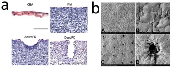 (a) H&E of CEAs (at in vitro culture day 20), and flat electrospun COL dermal templates (5 days after seeding with human dermal Fs), ActiveFX & DeepFX (laser-treated groups). CEA and dermal template scale bar = 100 and 200 µm. Photo reused with permission [] © 2020 Tissue Engineering: Part A, Mary Ann Liebert, Inc. (b) SEM of HFs-seeded dermal components before (flat, A,B) and after (ridged, C,D) laser treatment, before seeding HKs. Photo used with permission [] © 2020 Acta Materialia Inc. Published by Elsevier Ltd.