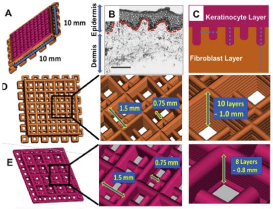 Schematic representation of the design of 3D Bioprinted construct. (A) Graphical representation of the Computer-Aided Design of the dual-layered skin model. The epidermis has been designed to create the dermis at regular intervals to form rete ridges. (B) Human skin representation, showing the dermis DEJ. (C) The structure design strategy for the 10 mm × 10 mm. (D,E) Detailed layer design dimensions of the dermal and epidermal layers. Design dimensions of the dermal layer (10 layers) and epidermal (8 layered filaments, arranged perpendicular to each other (in X and Y axes) with an interfilament spacing of 0.75 mm and Z-axis increment of 0.08 mm between each layer). Photo used with permission [] © 2020 Bioprinting. Published by Elsevier Ltd.