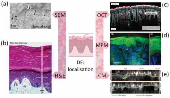 Techniques that are regularly used for the DEJ localization. (a) SEM of a normal DEJ (70-nm-thick human skin sections). Photo reprinted with permission [] © 2017 Macmillan Publishers Limited, part of Springer Nature. (b) H&E of a normal skin to identify the epidermal and dermal layers and cells. Photo reprinted from lab.anhb.uwa.edu.au. (c) OCT to evaluate skin layer boundaries. Photo reprinted with permission [] © 2020 Frontiers in Medicine and Dermatology, Frontiers. (d) The cross-sectional MPM of the epidermis, DEJ, and dermis. Photo reprinted with permission [] © 2019 Frontiers in Medicine and Dermatology, Frontiers. (e) CM stack of 40 images, 1 μm depth spacing, of dark skin, indicating epidermis, DEJ, and papillary dermis. Photo reprinted with permission [] © 2015 Journal of Investigative Dermatology, Elsevier.