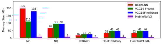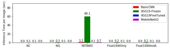 MobileNetV2 has the smallest memory requirement for all levels of quantisation. For other models, the level of quantisation determines the memory consumption. Overall, Basic CNN has the largest memory requirement when not converted (NC) to the mobile version of the model. However, when converted to mobile format but not quantised (NC), VGG-19 models would have higher memory requirements than Basic CNN. This reduction in size for basic CNN remains the same for all other levels of quantisation. Hence, apart from MobileNetV2, basic CNN is the next model to be considered when a quantised model is to be deployed in a mobile device if optimised memory is the major design goal. Since CPU utilization is related to power consumption [,], MobilNETV2 has higher architectural improvement by energy savings.