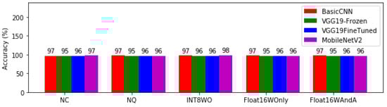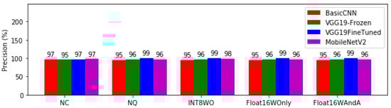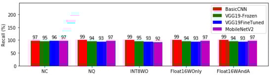 The result shows that all our trained models have recall ranging from 92% to 99% across all quantization levels. INT8WO has the least percentage capability for the two most promising models—BasicCNN and MobileNETV2. However, prior conversion (NC) recall capability for both remained 97% and changed dramatically after conversion (NQ), with BasicCNN rising to 99% while MobileNetV2 dropped at Integer8 quantization with weight only (INT8WO). VGG19-Frozen and VGG19FineTuned had the weakest recall capability. Figure 7 depicts the recall for model architectures at different levels of quantization.