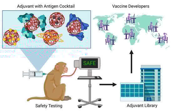 One potentially valuable approach to preparing for the next pandemic would be to create a library of well-characterized, “ready-to-use” adjuvant platforms. Ideally, these adjuvants would have previously demonstrated the ability to promote a robust and protective immune response for a diverse set of antigens so that pandemic antigens can be rapidly tested with promising candidates to determine the most effective vaccine formulation. Although there are many adjuvants currently in preclinical development that could improve global readiness for future pandemics, the sluggish adoption of new adjuvants can be attributed to safety concerns, regulatory hurdles, and issues with technology transfer. Safety is one of the biggest public concerns when it comes to the development of new vaccines and vaccine adjuvants, and, due to the complexity of the immune system, an adjuvant’s safety with one antigen does not necessarily prove its safety with all antigens. Consequently, adjuvants will ultimately be approved for use only as part of a specific vaccine formulation rather than receiving blanket approval. Unfortunately, this reduces the financial incentives for vetting adjuvant safety without a specific vaccine in mind. Additionally, without extensive preceding safety studies, companies developing vaccines for emerging pandemics are disincentivized from testing their new antigen with a “risky” adjuvant, even if it has the potential for superior immunological outcomes []. To address these issues, prospective public- or foundation-funded high-throughput safety testing of emerging adjuvants could be developed to establish a broad safety profile with a variety of antigens and thereby de-risk the incorporation of adjuvants in vaccines developed in response to a pandemic. Non-human primate (NHP) safety studies are the best way short of human testing to demonstrate adjuvant safety but require many animals, which raises both financial and ethical concerns during vaccine development [].