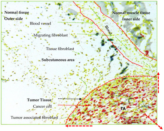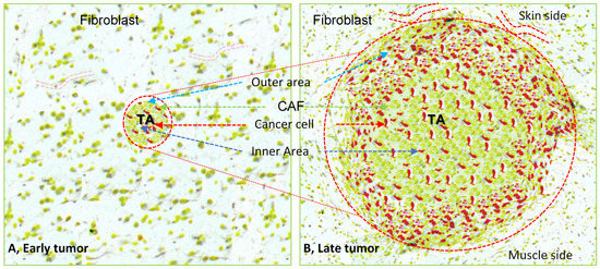 It is known that the greater the formation of blood vessels in TME, the higher the proliferation of cancer cells and CAFs, thereby, extending the area of tumor mass (more often in a skin site) as compared with an area with less blood supply (more often in a muscle site) where tumor mass cannot extend much (Figure 2) [4,111,112]. The histology and immunohistochemistry of xenografted tumor sections have shown that the outer area of a tumor has an abundant blood supply with many fat cells as compared with the central area of a tumor [4,113]. It suggests that, as the tumor grows, the cells in the central core area are relatively less active or in the quiescent phase or undergo necrosis after a certain period. Later, liquid stroma fills the tumor necrotic core [114,115].