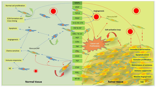 Schematic representation of the signaling cascades of the normal fibroblasts and CAFs for normal and tumor tissue function, respectively. Normal tissue fibroblasts and/or myofibroblast (MF) or fibrocytes play a vital role by maintaining normal tissue homeostasis through normal tissue proliferation, ECM secretion, cell–cell and cell–ECM interactions, angiogenesis, apoptosis, and chemosensitivity through various inter- and intra-coordinated communications. Normal communications within normal cells through various signaling factors and cascades are disturbed and disoriented by cancer cells, leading to excessive cell proliferation and ECM secretion. ECM becomes stiffer with a significant increase in inter- and intra-cell to cell, or cell to ECM communications. Tumor tissue has a massive angiogenesis process with the ability to suppress apoptosis mechanisms. Increased tolerance by tumor tissue to an anticancer therapy speeds up uncontrolled tumor tissue growth as compared with check-and-balance normal tissue growth. The biological factors in the green box represent the factors released from both normal fibroblasts at a normal level and CAFs at an excessive level. The dotted blue arrows represent the normal secretion of factors and function on different cells for normal homeostasis, and the dotted red arrows represent the excessive secretion of factors and function on different cells for tumor tissue microenvironment. MMPs, matrix metalloproteinases; VEGF, vascular endothelial growth factor; PDGF, platelet derived growth factor; IL-6, interleukin-6; IL-17A, interleukin-17A; EGF, epidermal growth factor; IGF, insulin growth factor; CXCL 7 and 10 platelet-derived chemokines CXC chemokine ligand (CXCL) 7 and 10; HGF, hepatocyte growth factor; CCR, C-C chemokine receptor types 2; TNF, tissue necrotic factor; INF-γ, interferon-γ; CCL5, C-C motif chemokine ligand 5; FGF, fibroblast growth factor; CTGF, connective tissue growth factor; PGE2, prostaglandin E2; NF-kB, nuclear factor kappa-light chain. Self-activation property of CAFs supports for rapid tumor cell proliferations and tumor growth. TF, tissue fibroblast; NE, normal environment; TME, tumor microenvironment.