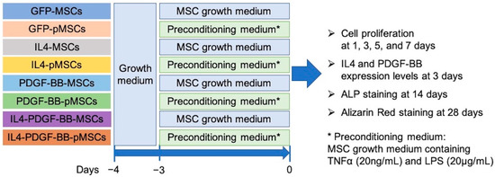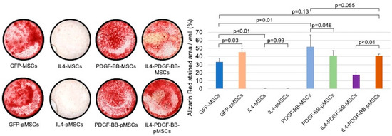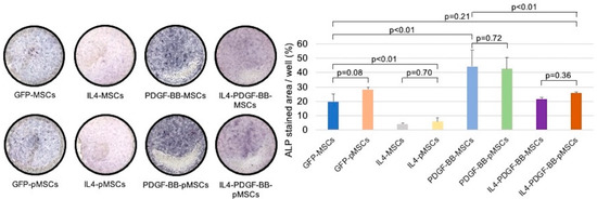 | GFP-MSCs | GFP-pMSCs | IL4-MSCs | IL4-pMSCs | PDGF-BB-MSCs | PDGF-BB-pMSCs | IL4-PDGF-BB-MSCs | IL4-PDGF-BB-pMSCs | |